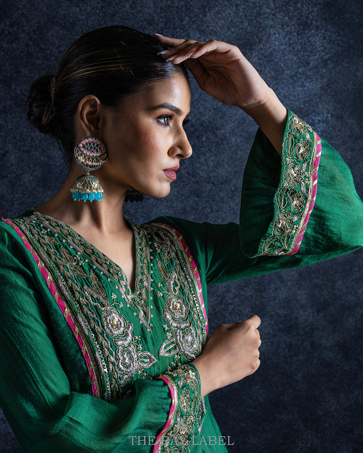This three piece set includes asymmetrical peplum, sharara pants and dupatta Work/features: Hand embroidered Bottle Green Chanderi silk peplum - V-neckline - Zardosi embellished yoke and sleeves - Full length bell sleeves - Front hook open - Asymmetrical hemline