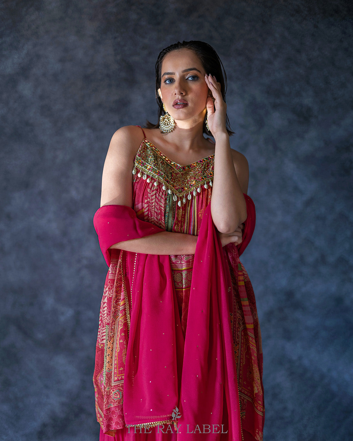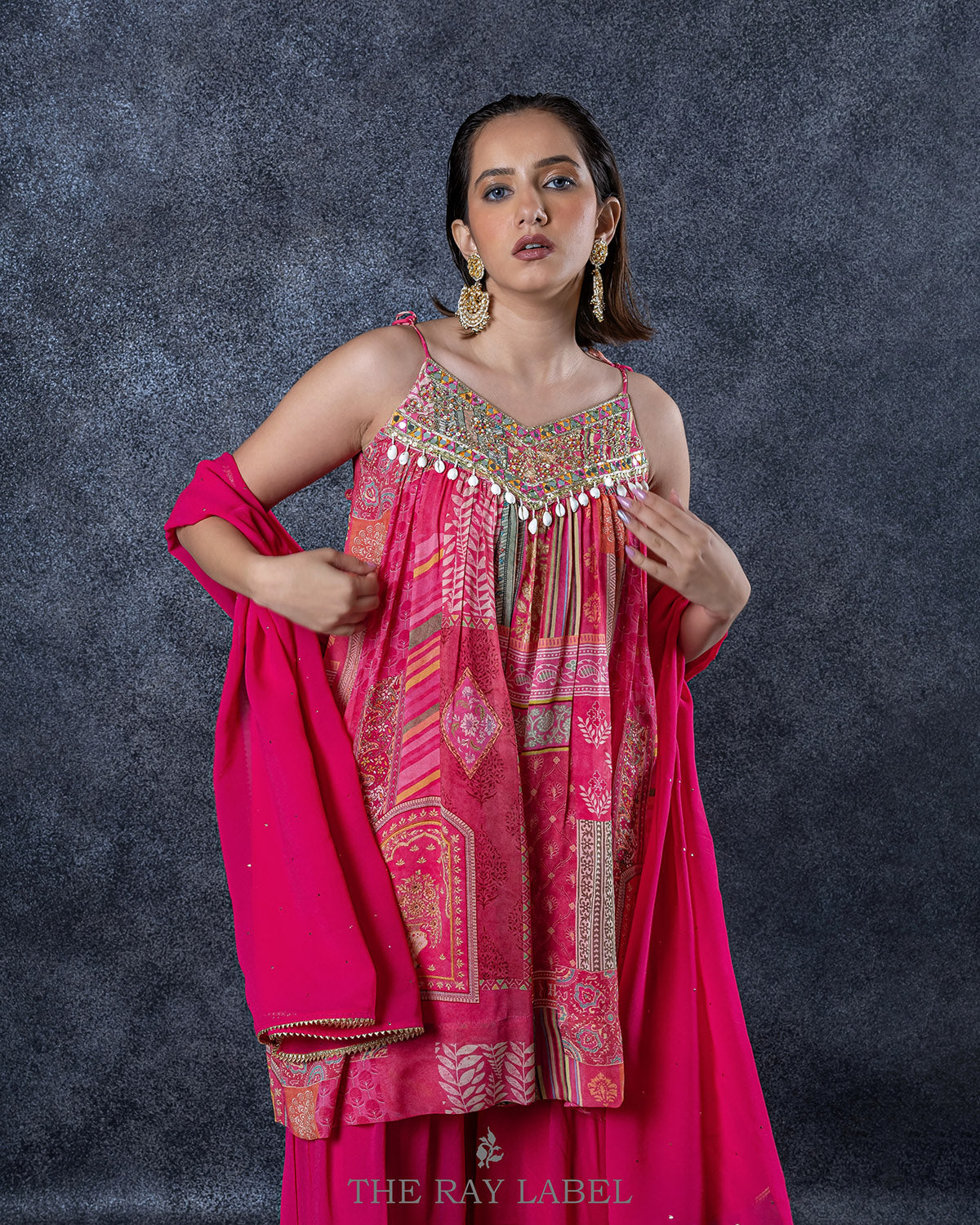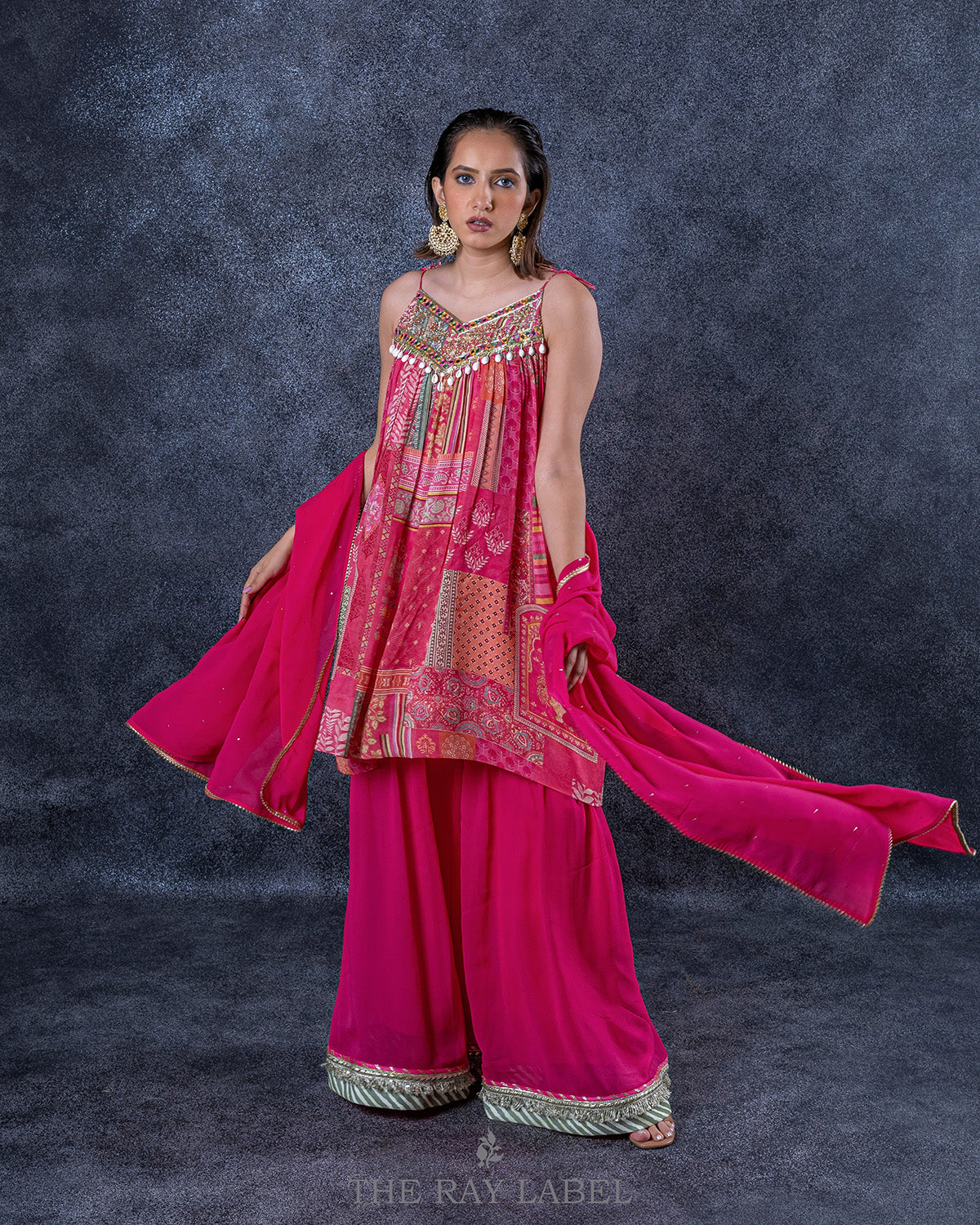 This three piece set includes- short kurta, palazzo pants and dupatta Work and features of the product- Fuchsia pink multi print, short top with embroidered front yoke and dori tie-up on shoulders - Neckline: V neck - Delicate gathers below the embroidered yoke - Type of work: Mirror, Zardosi, Kodi, sequins, threads and beads - Sleeveless top