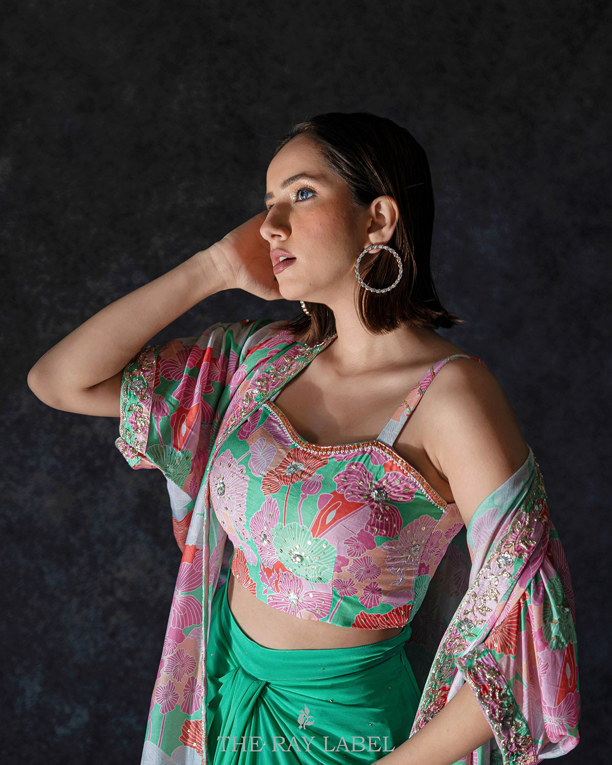 This three piece set includes draped skirt, bustier, asymmetrical jacket Work/ Features: Floral cotton silk bustier with zardosi embroidered front - 1"shoulder straps - Back opening