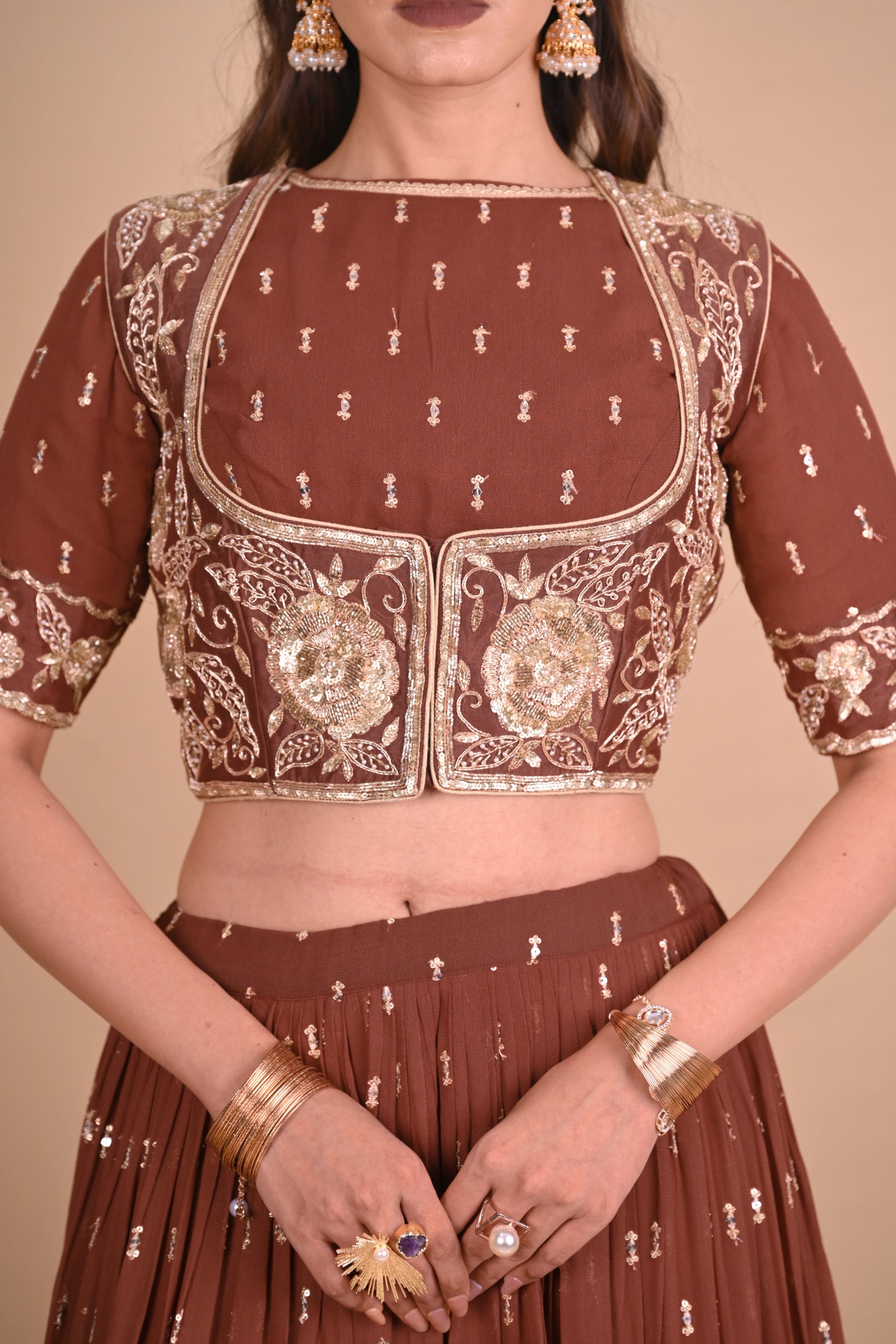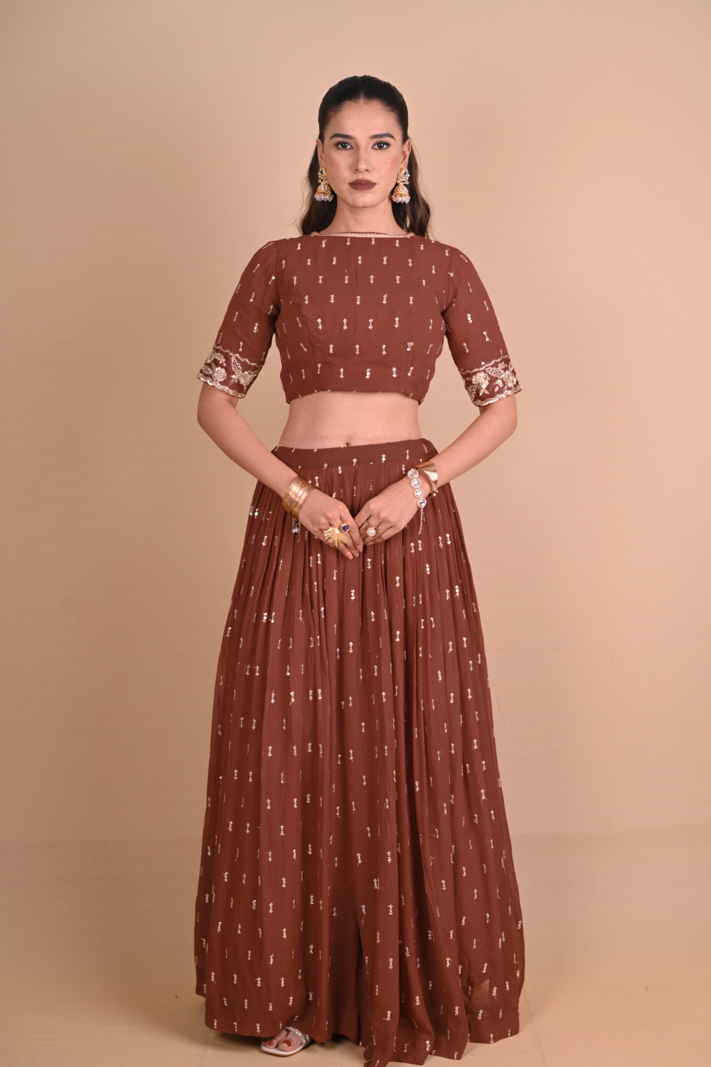 Features: - Hand embroidered sleeveless silk jacket with scoop front neckline. - Front hook opening. - Sequins embellished, pleated lehenga with side zip & dori tie up. - Cancan included. - Sequins embellished, elbow sleeves blouse with back hook closure. - Round neckline with trim embellishments and embroidered sleeve cuffs. - Brown dupatta with all over hand embroidered buttis and trim finish.