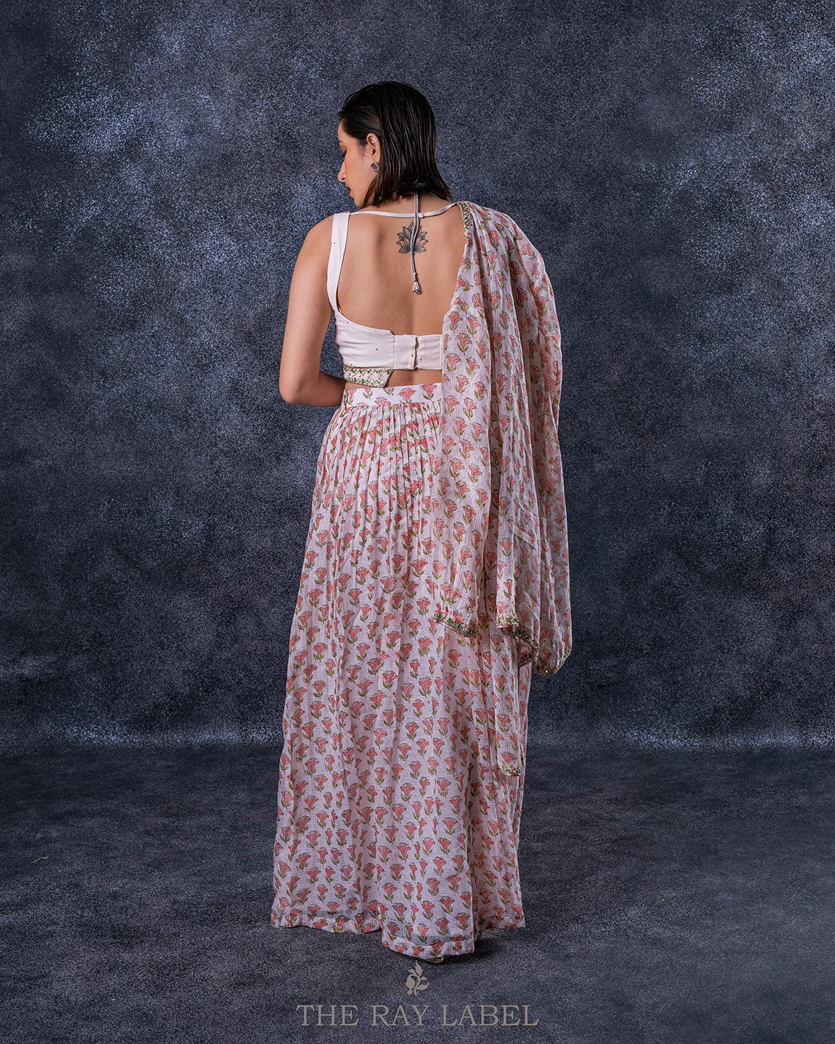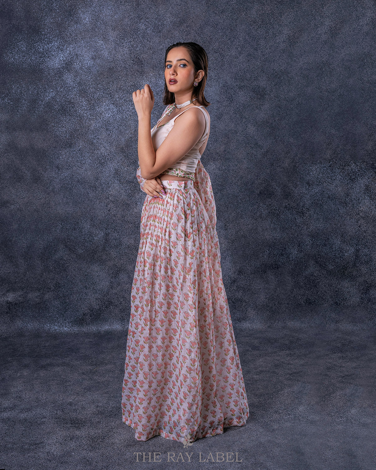 This three piece set includes blouse, skirt and jacket Work/ Features- Cream white skirt and jacket with all over hand blocked butti print in Kota doria silk - Pleated lehenga with cancan - Side zip opening