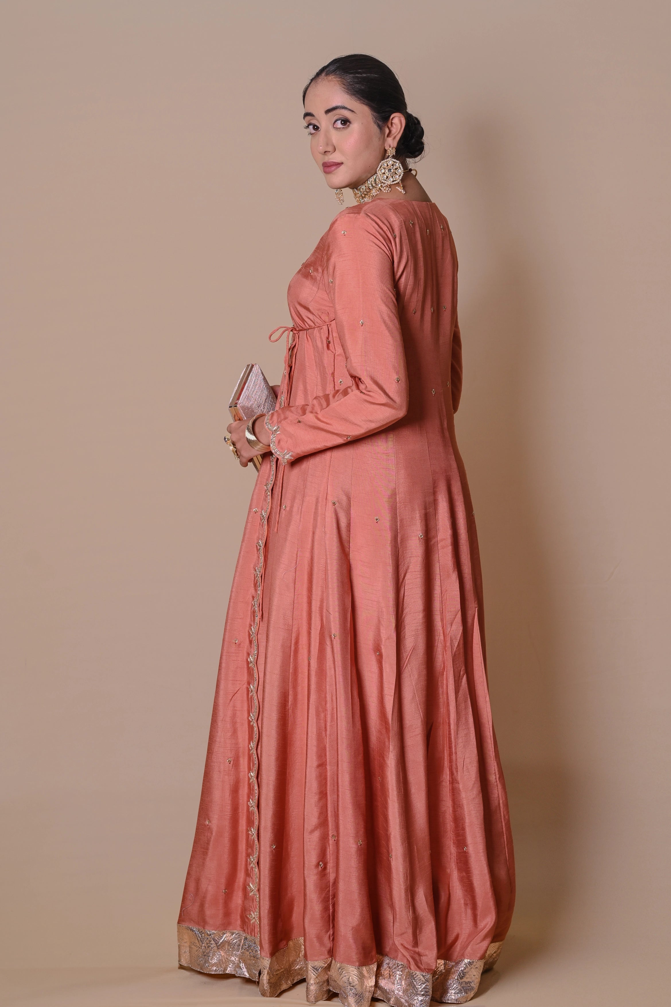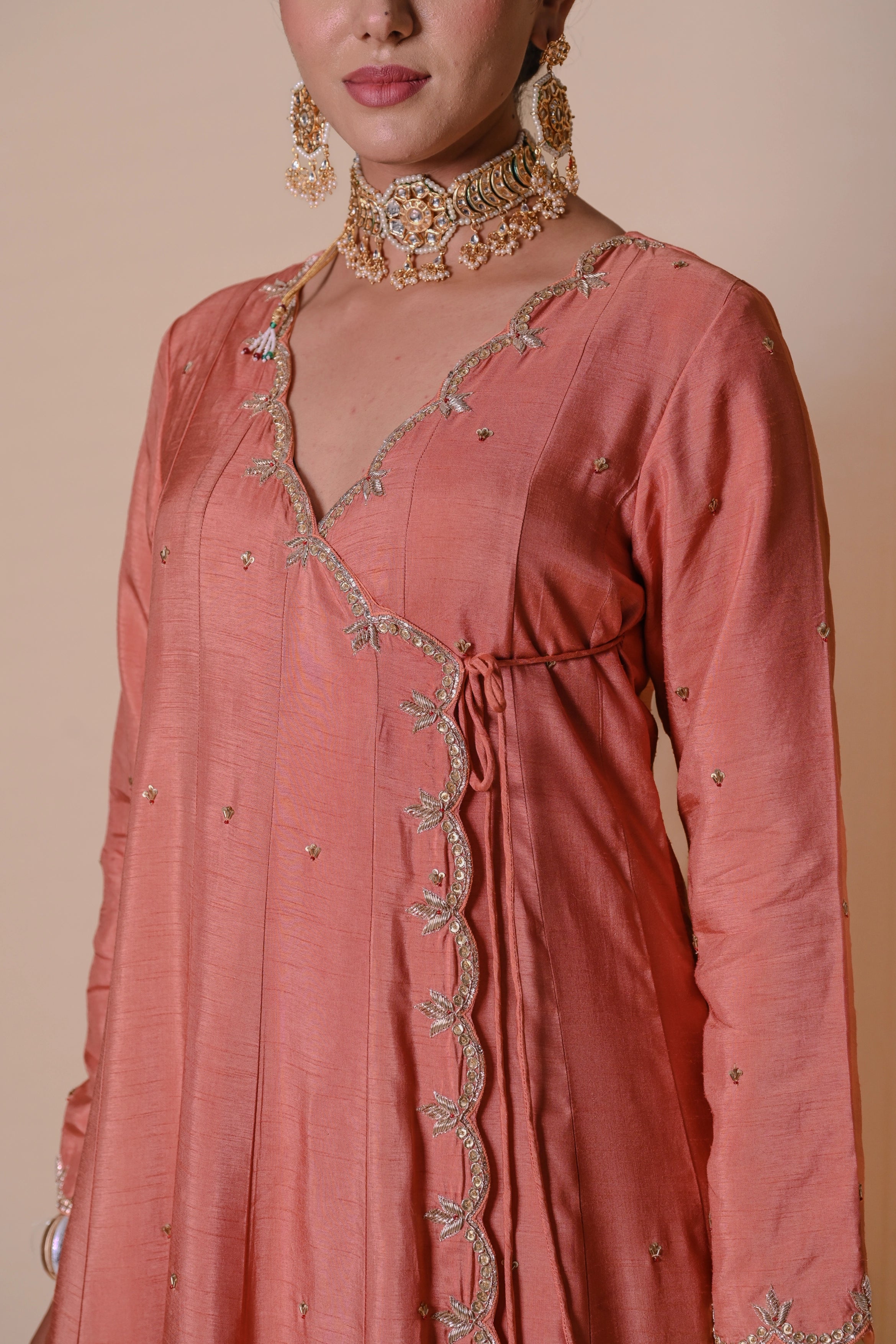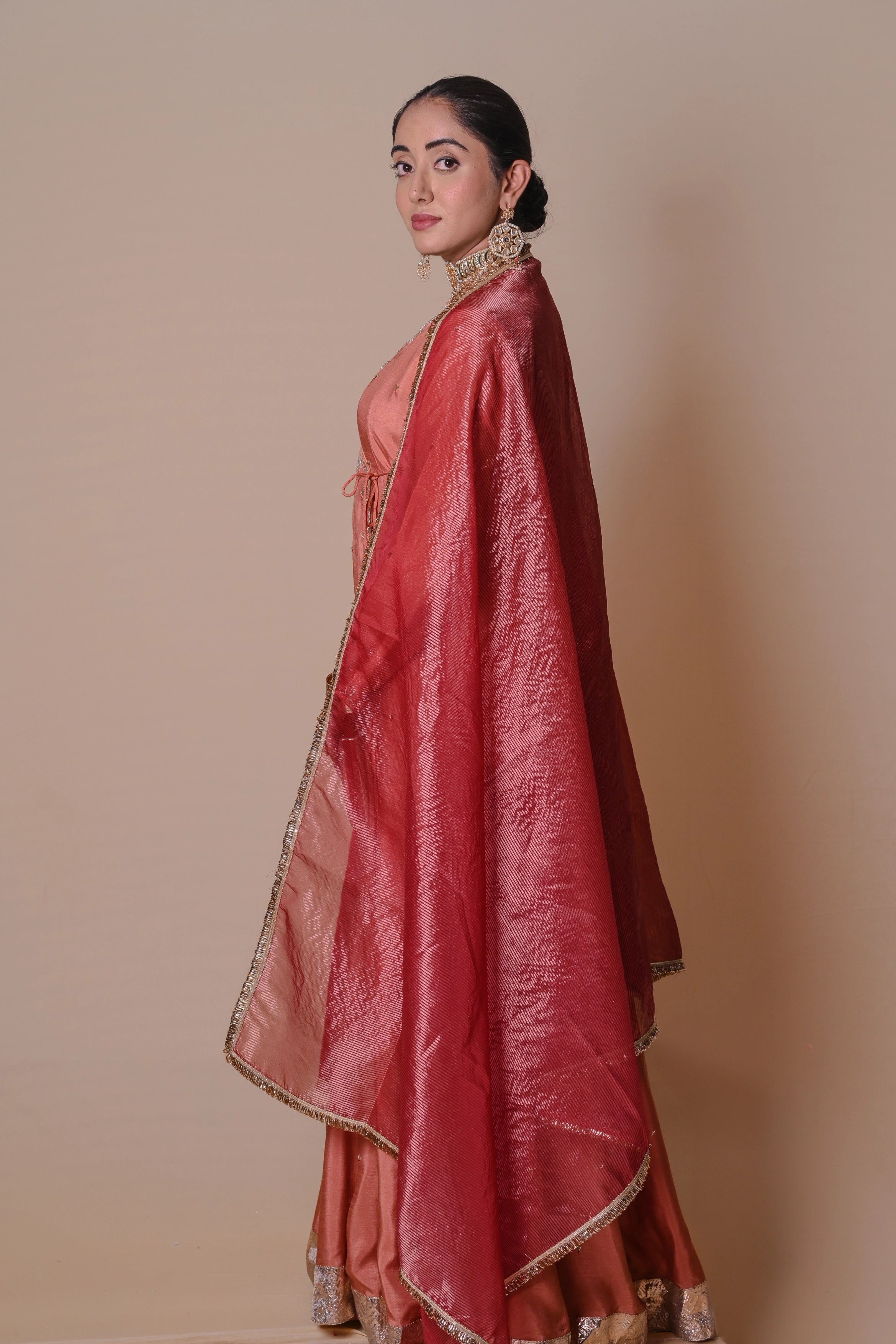 Features: - Scalloped hand embroidered Angrakha style Anarkali with side dori tie ups & tassels. - V-neckline and scalloped sleeves cuff hem. - Kalidar with all over delicate butti embellishment, both front, back and sleeves. - Gold lampa finished hem. - Slim fit silk pants with elastic waistband. - Red tissue dupatta with lace finish.
