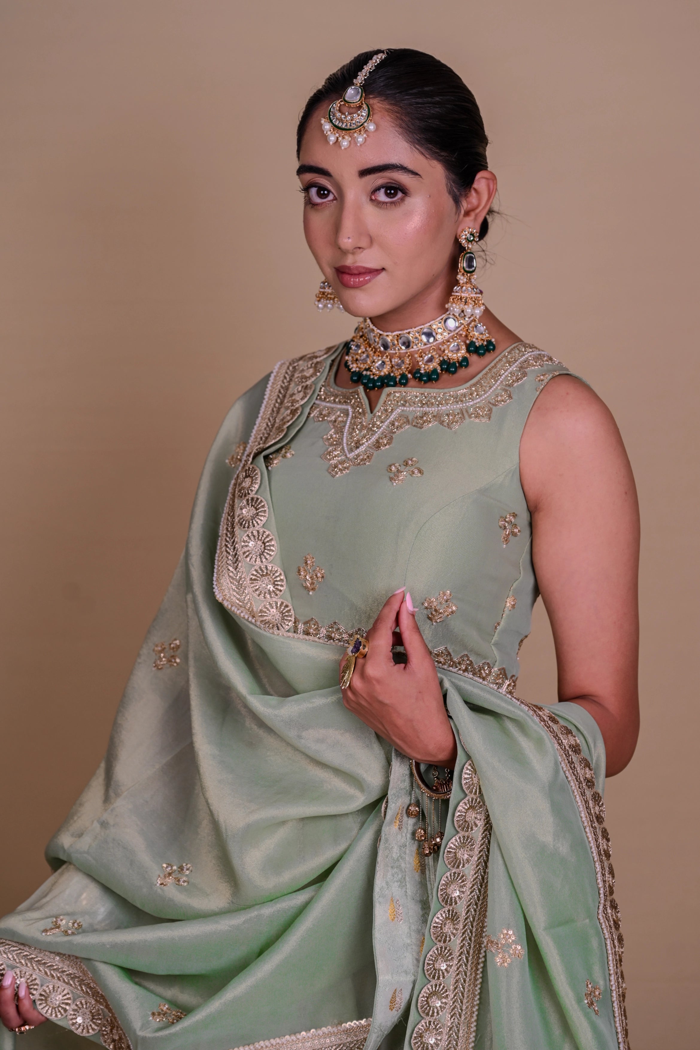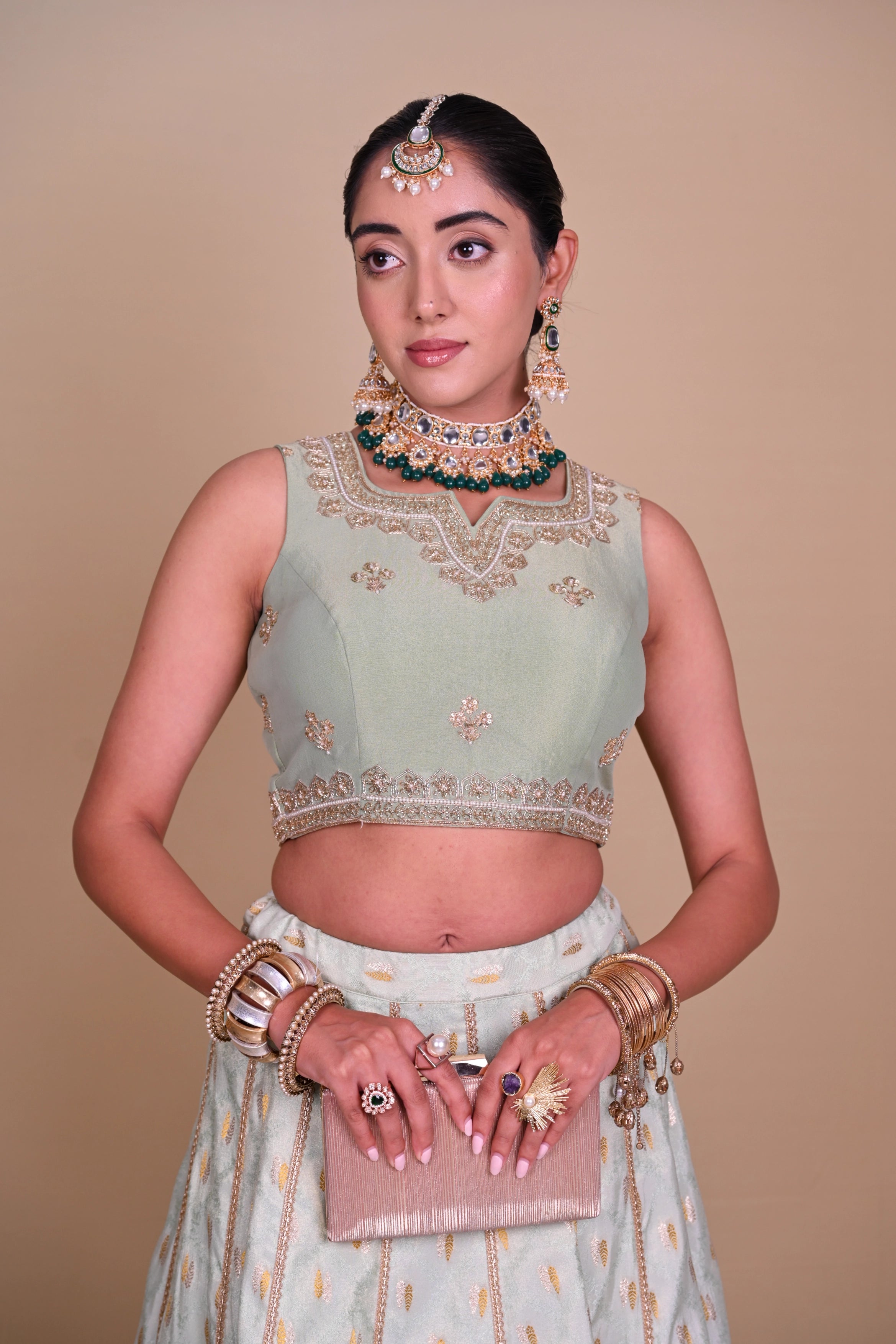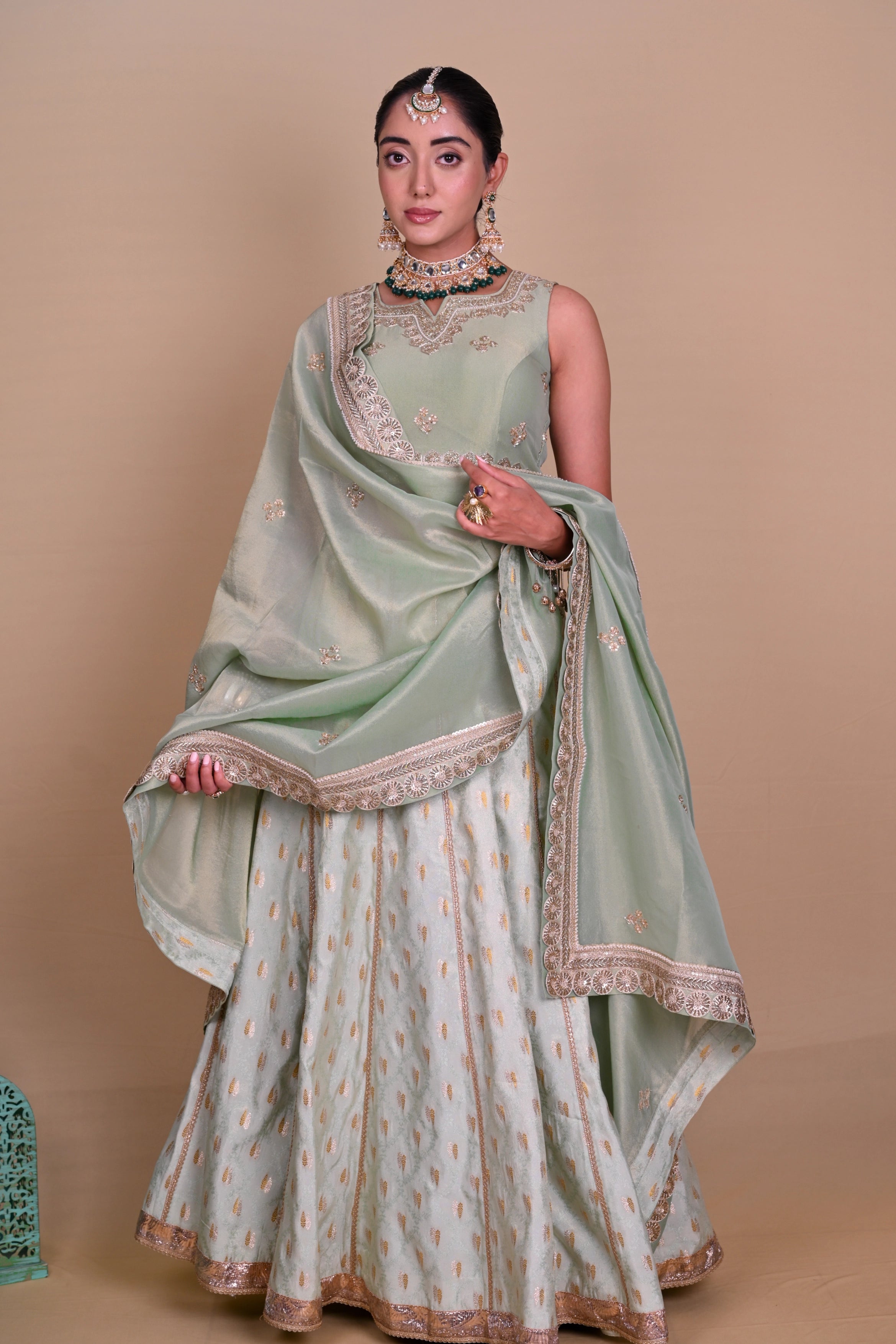 Color: Mint Green Components: 3 Materials: Lehenga- Jacquard silk, Blouse- Tissue silk, Dupatta- Tissue silk