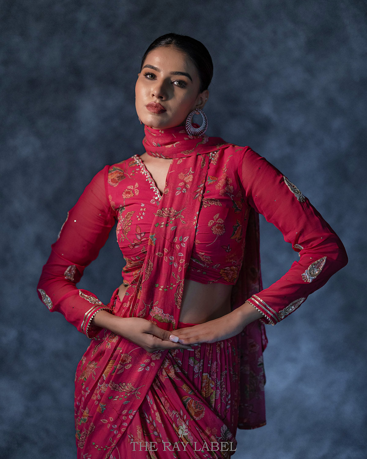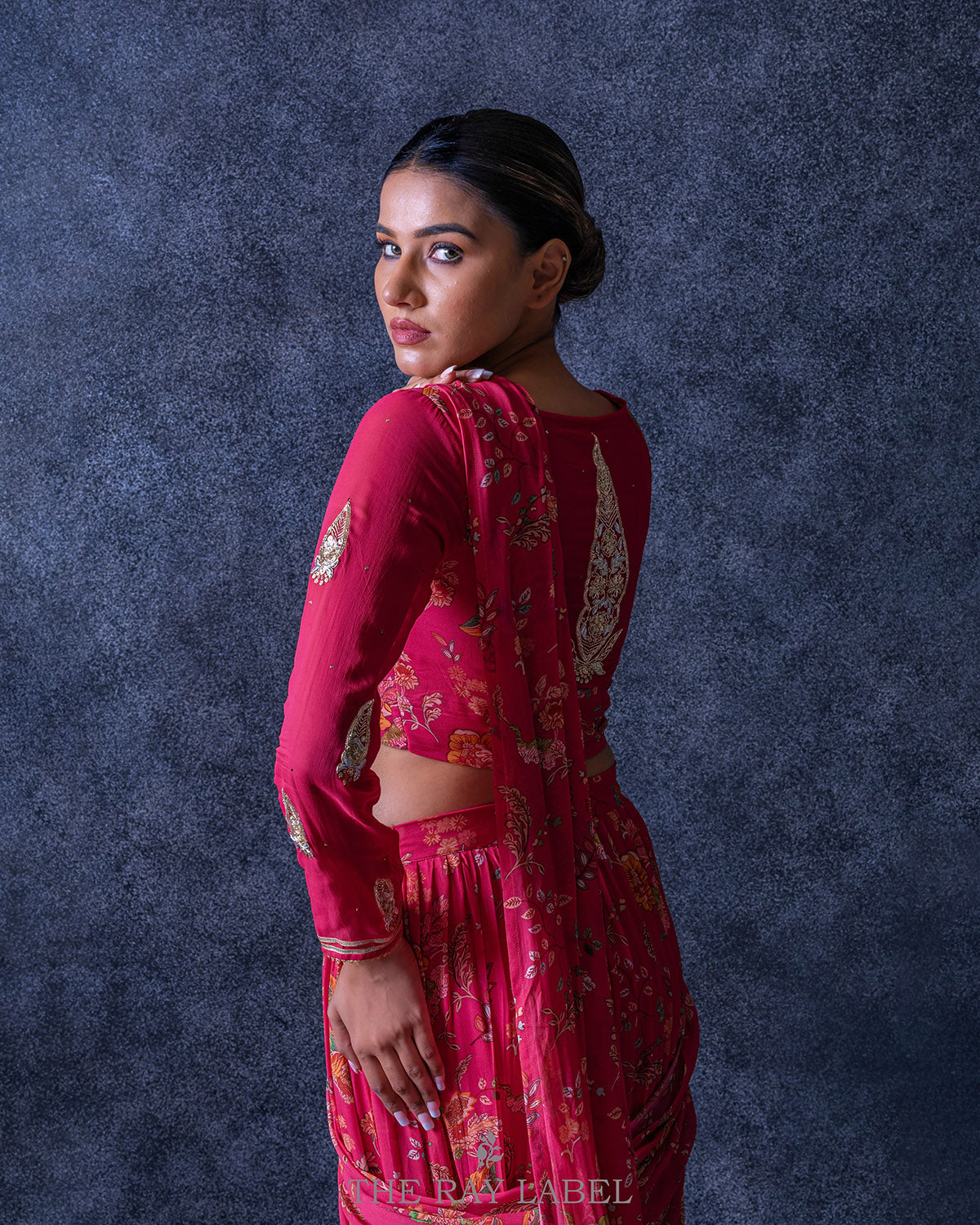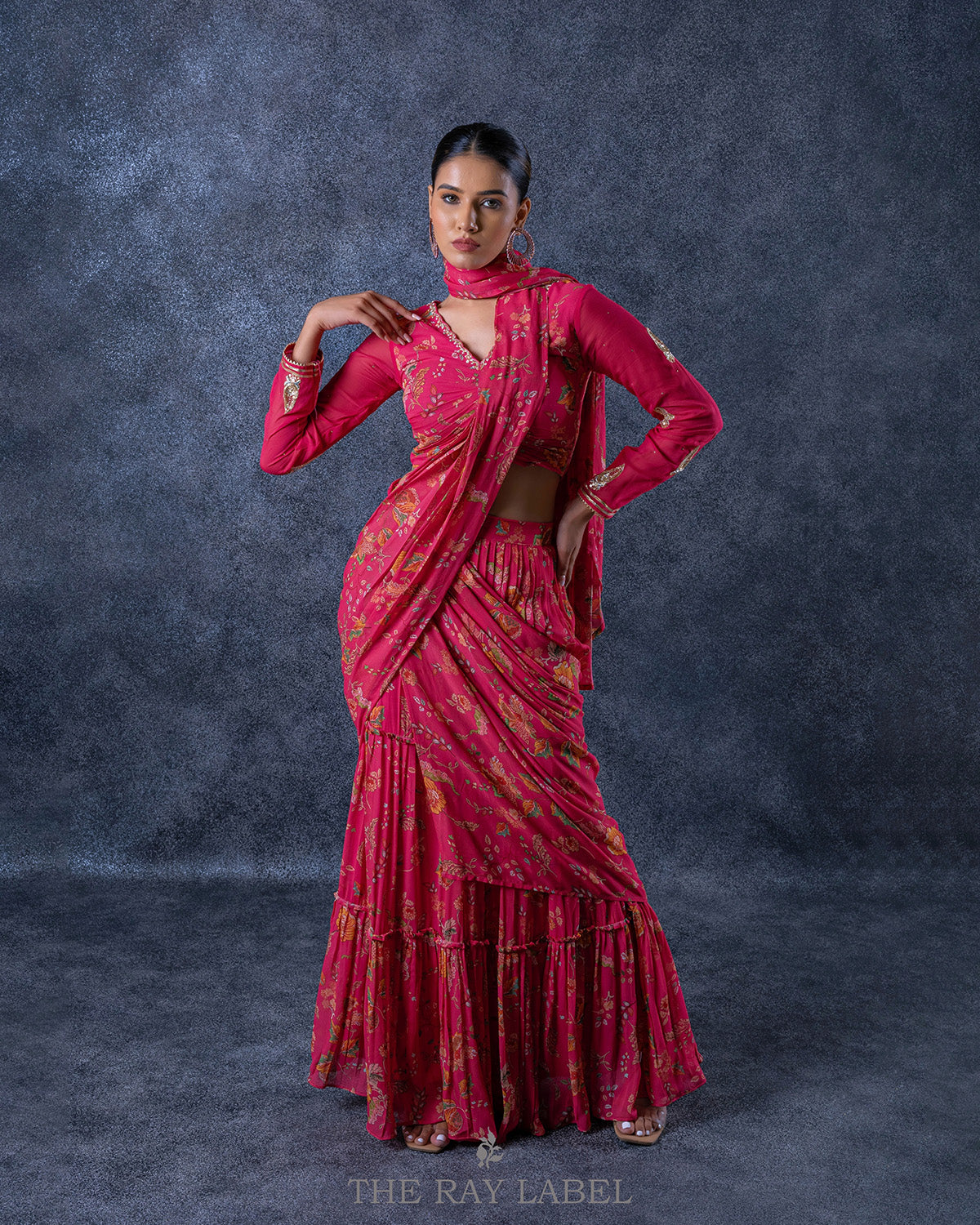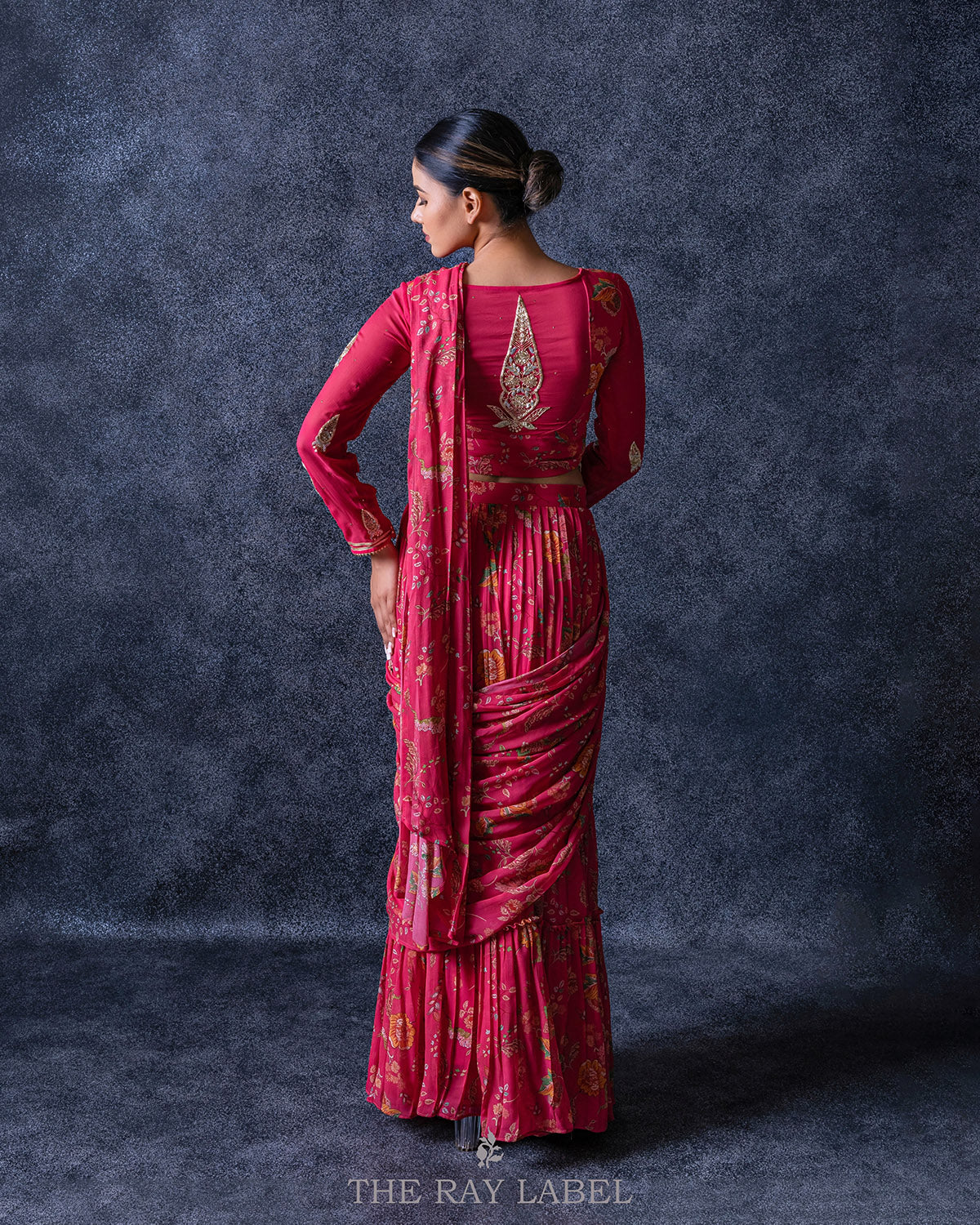 This two piece set includes Fuchsia pink pre draped saree and blouse Work/ Features- Three tiered, pre-draped Fuchsia pink georgette finely pleated saree - Floral print - Side zip opening