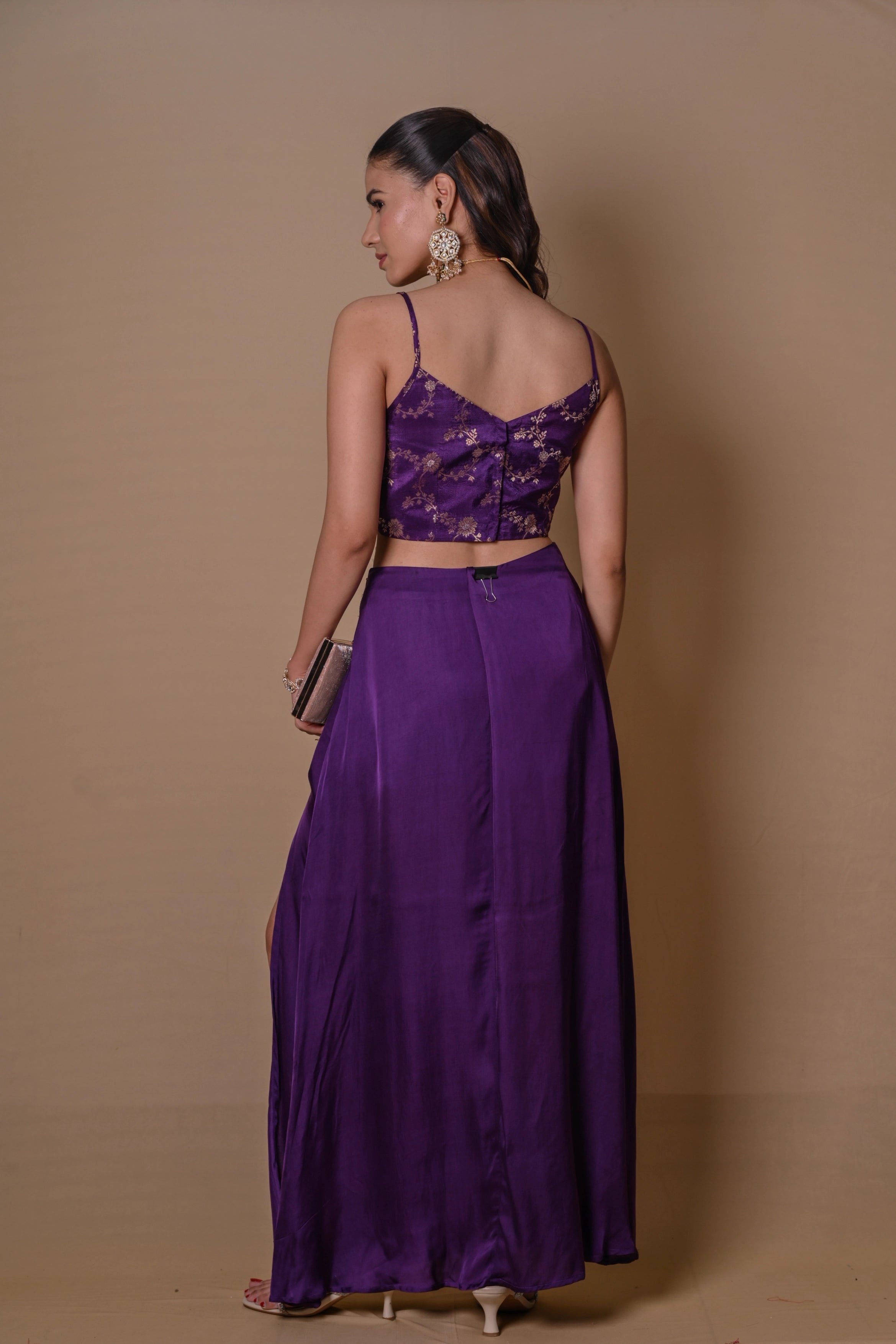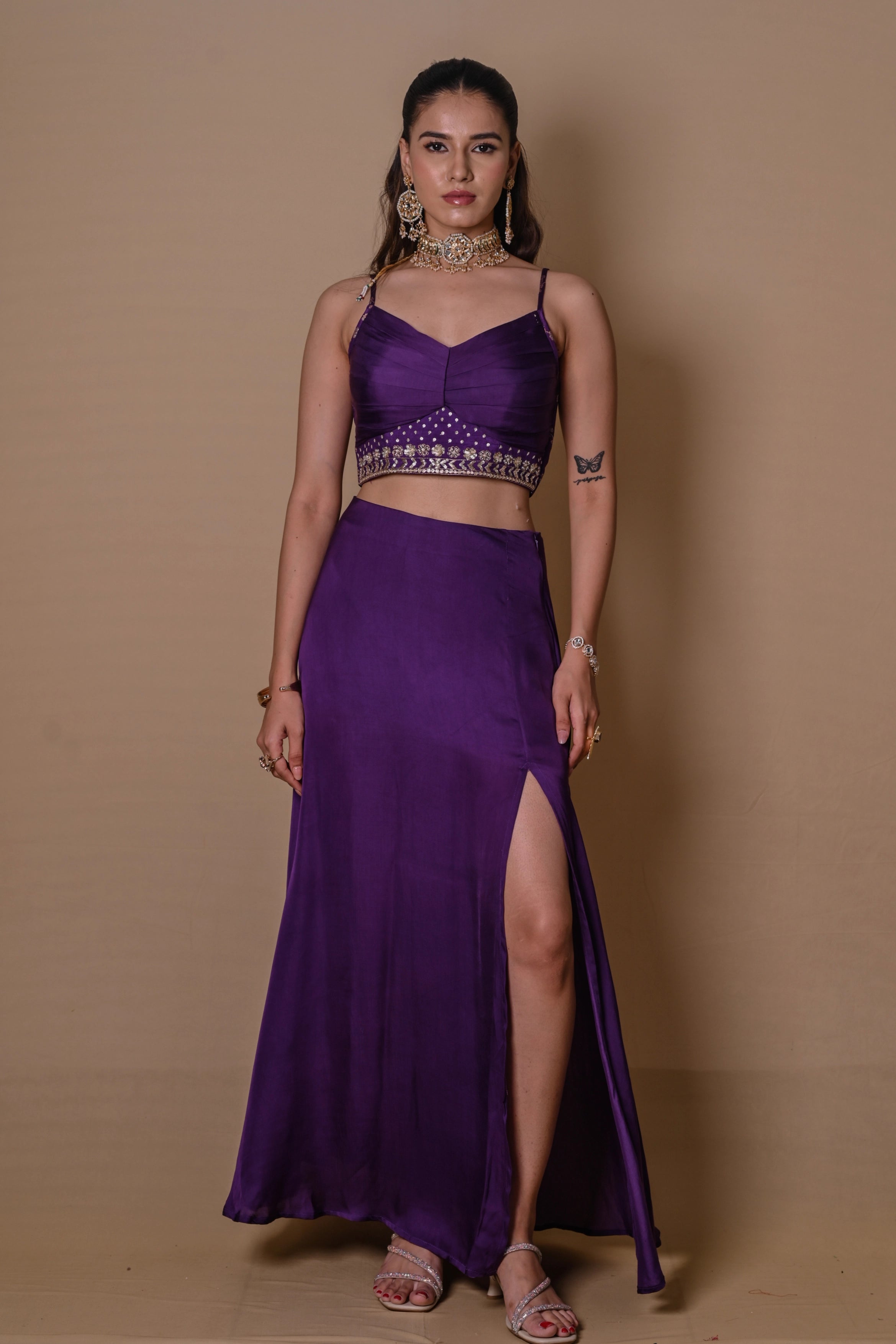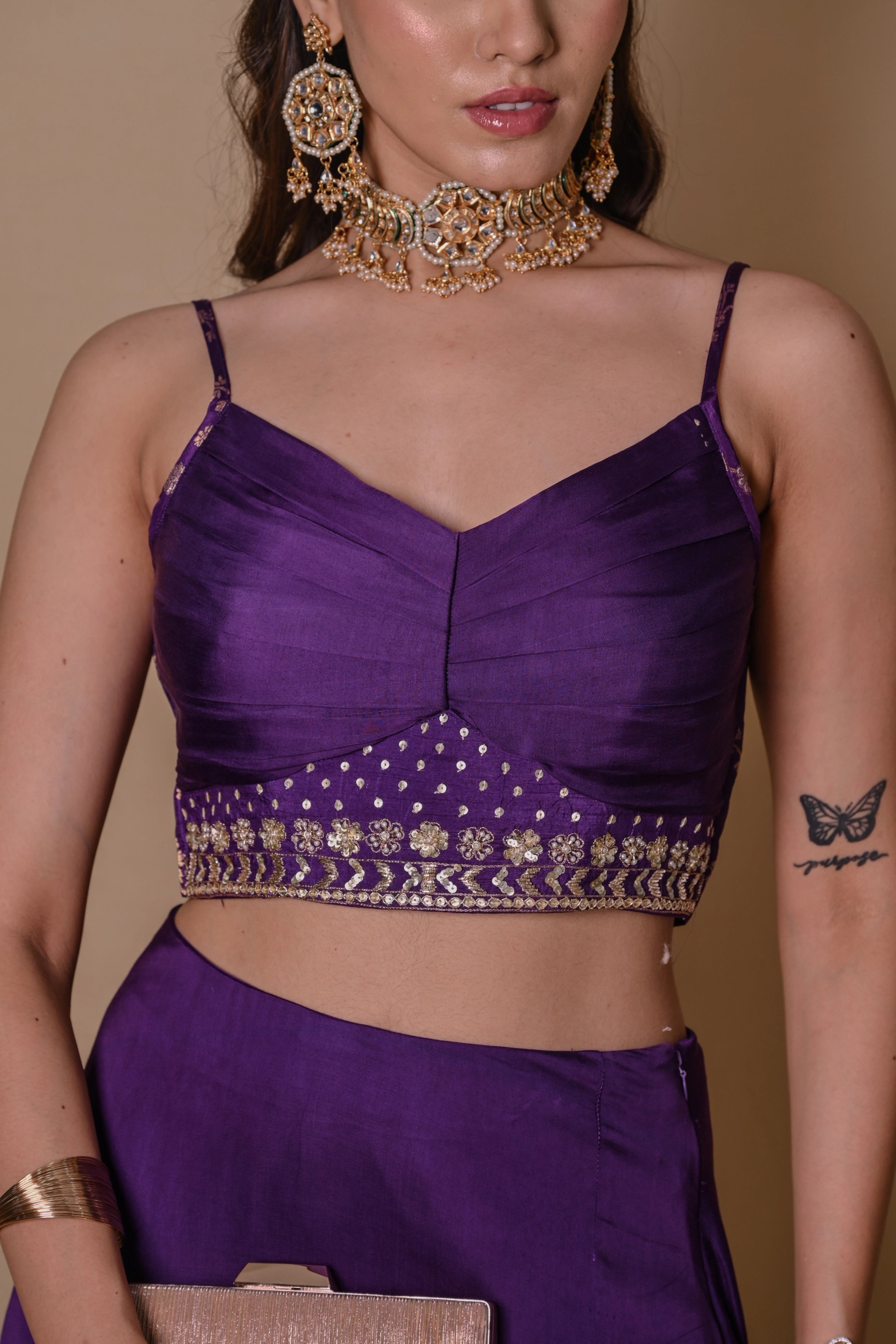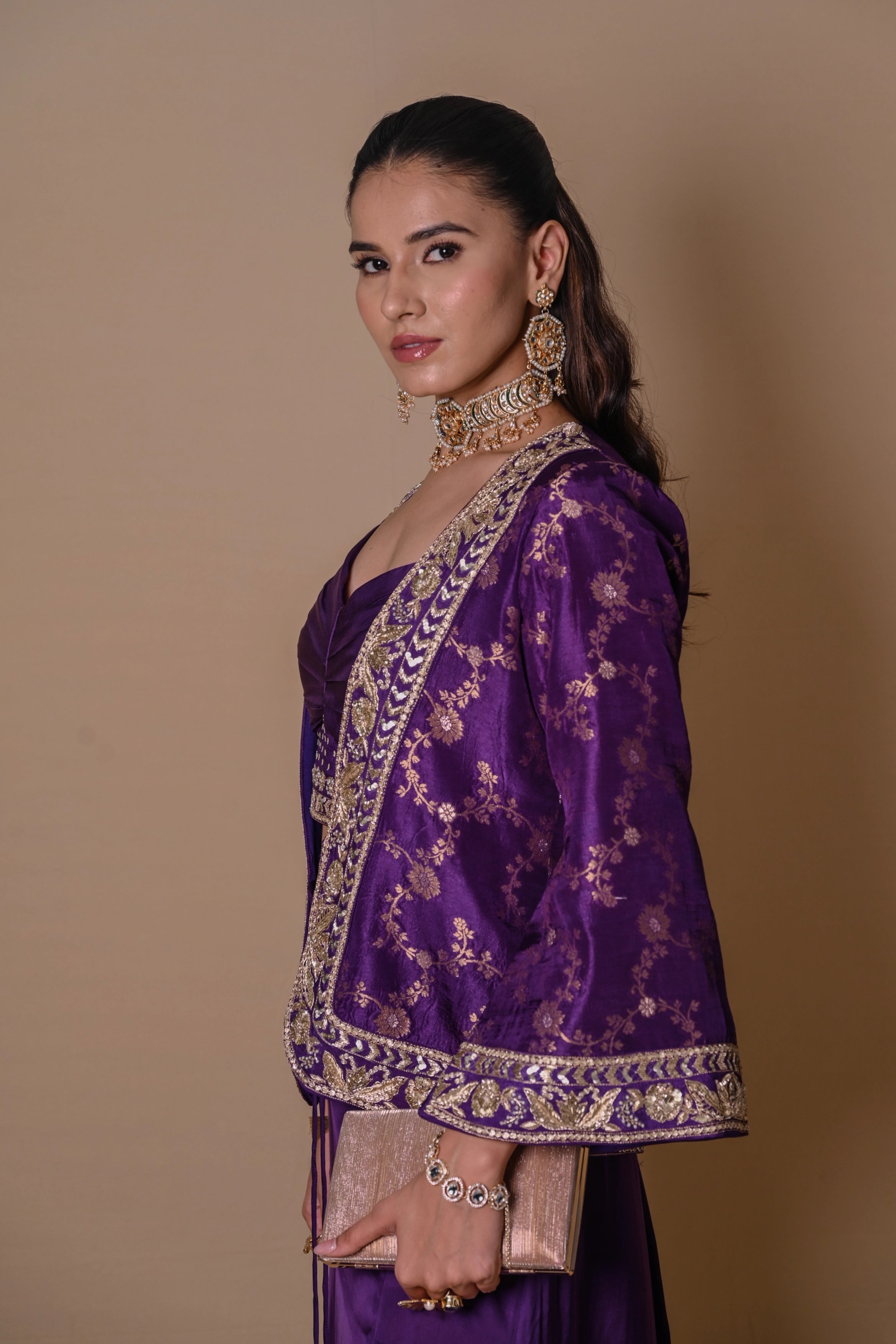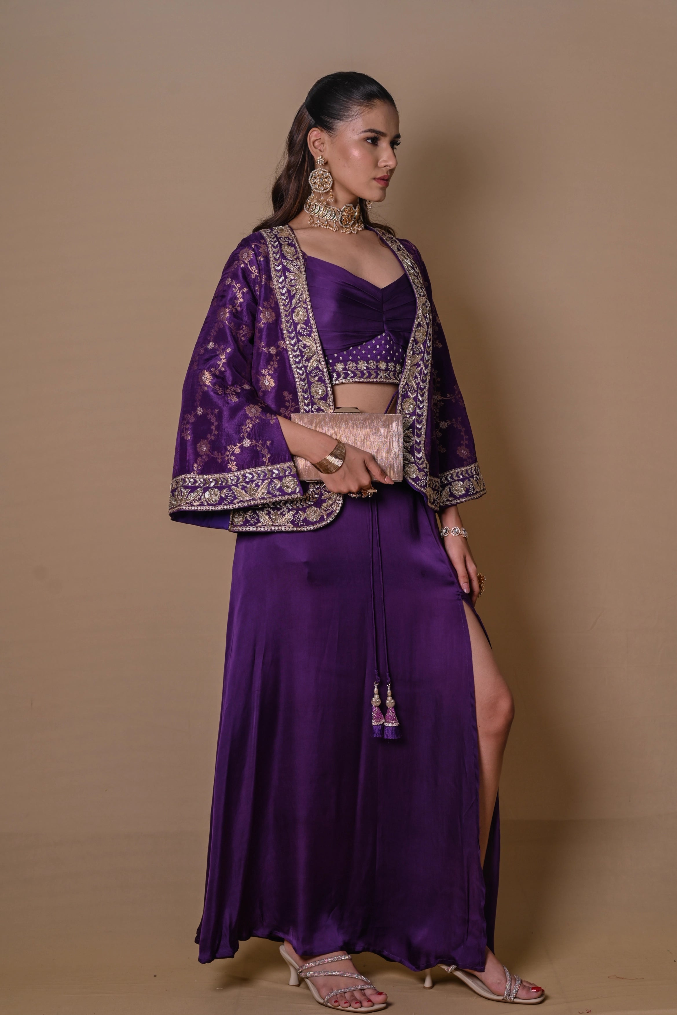 Features: - Hand embroidered, front open silk jacket. - Bell sleeves with elbow slit. - A- line skirt with long slit for a body flattering fit. - Side zip closure. - Pleated bustier with hand embroidery. - Jacquard back and shoulder straps. - Back hook closure.