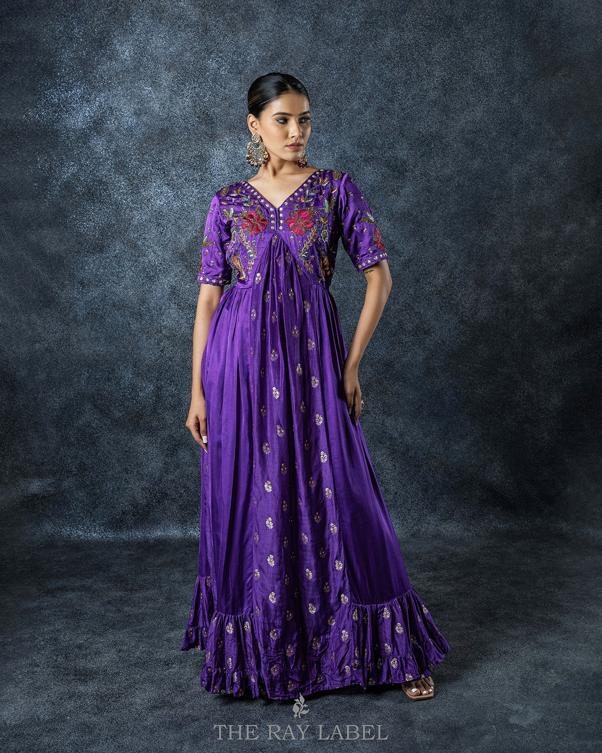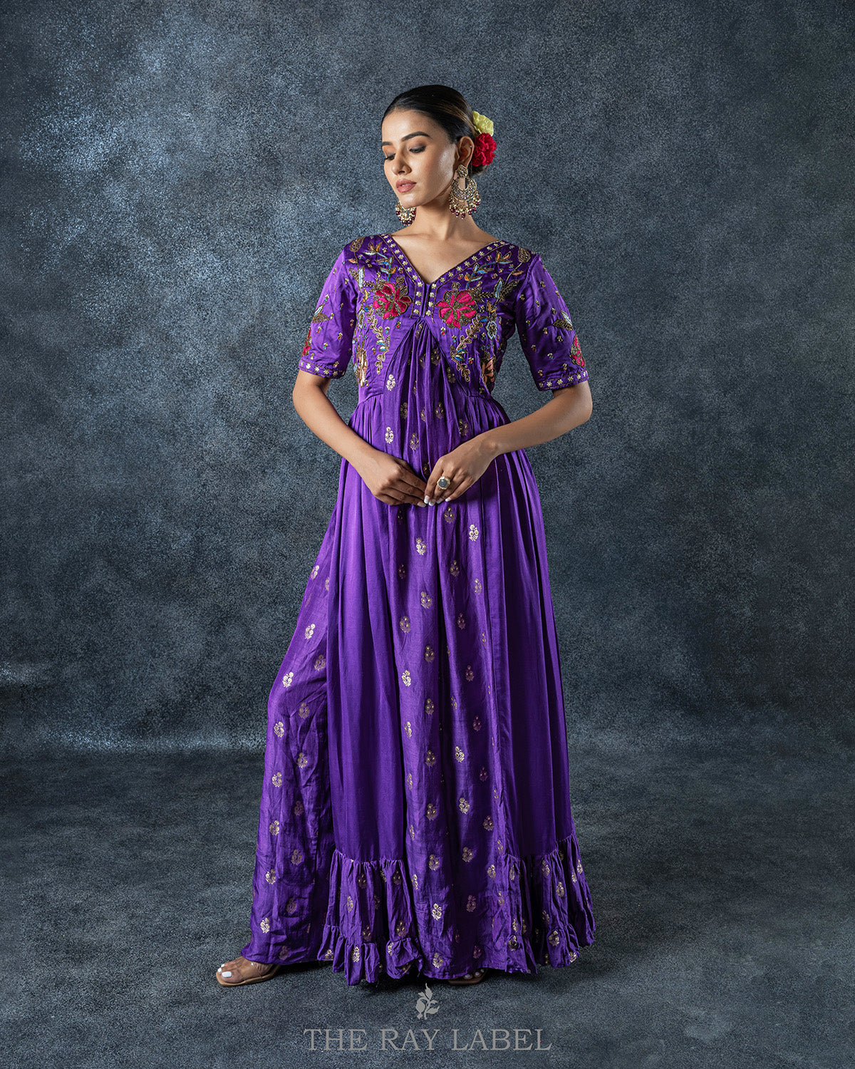 This 3 piece set includes pleated kurta, pants and dupatta Work/Features- Purple Anarkali suit with pleated jacquard silk center panel and hand embroidered yoke and sleeves - Neckline: V neck - Elbow sleeves - Type of embroidery- zardosi and thread work - High side slits