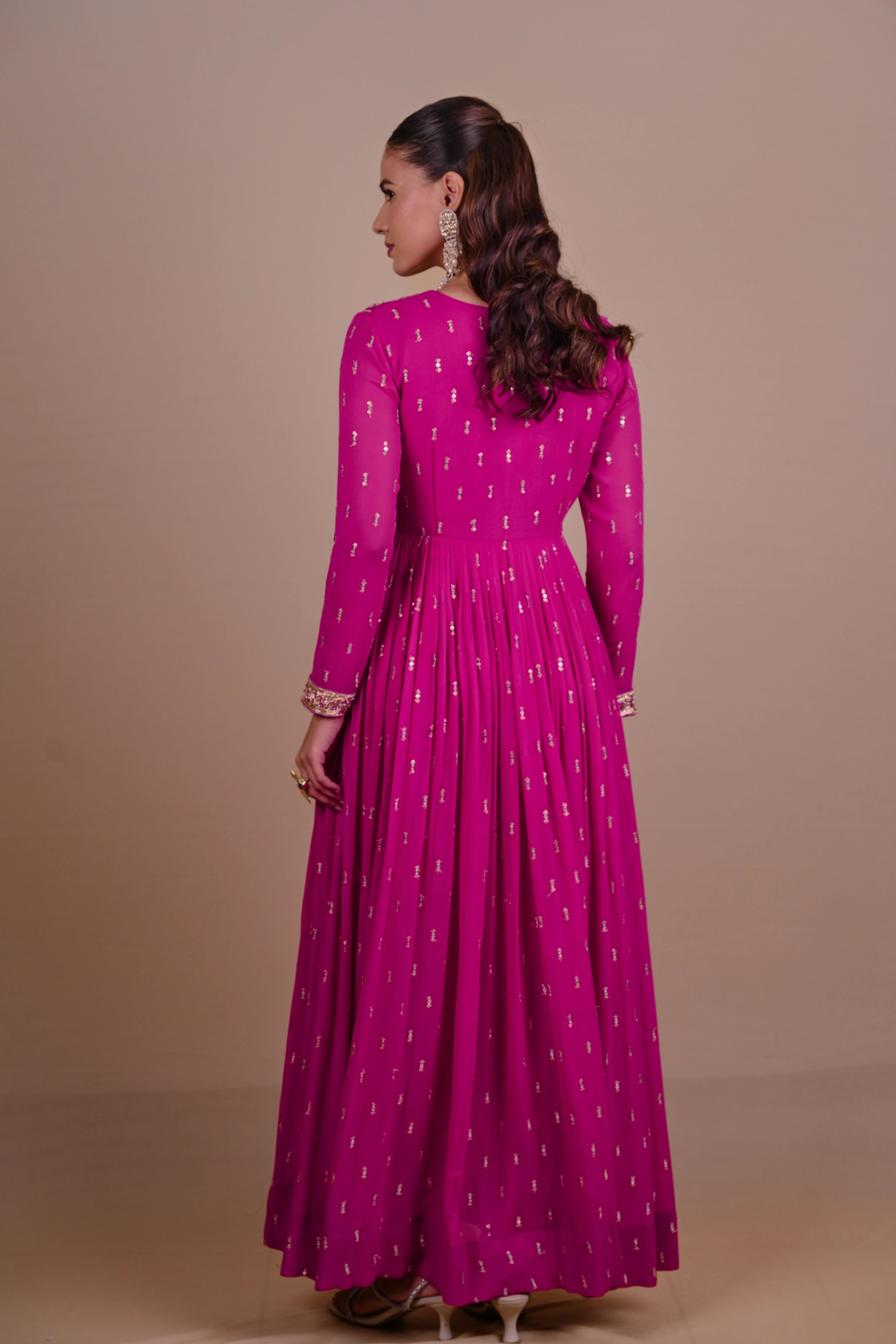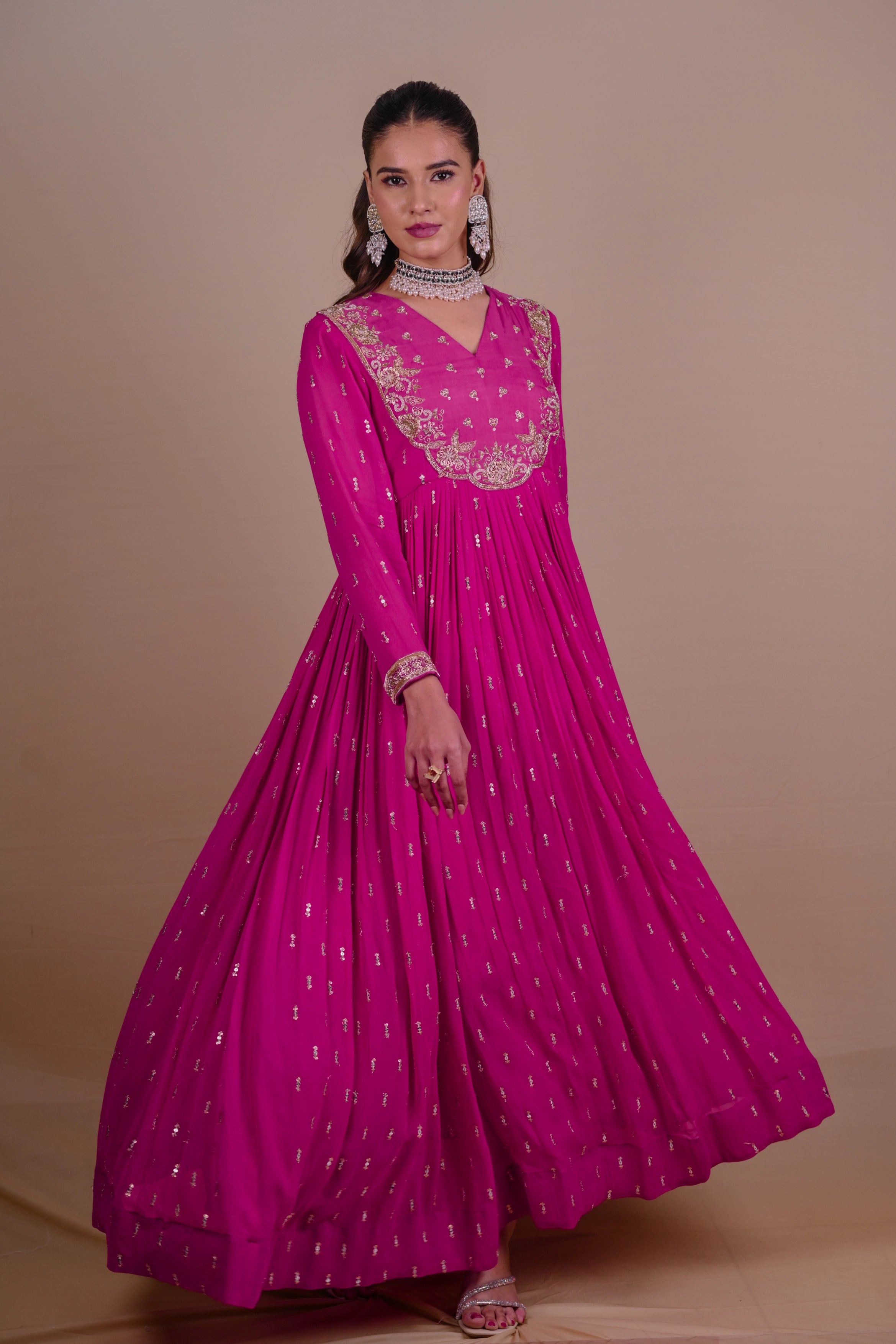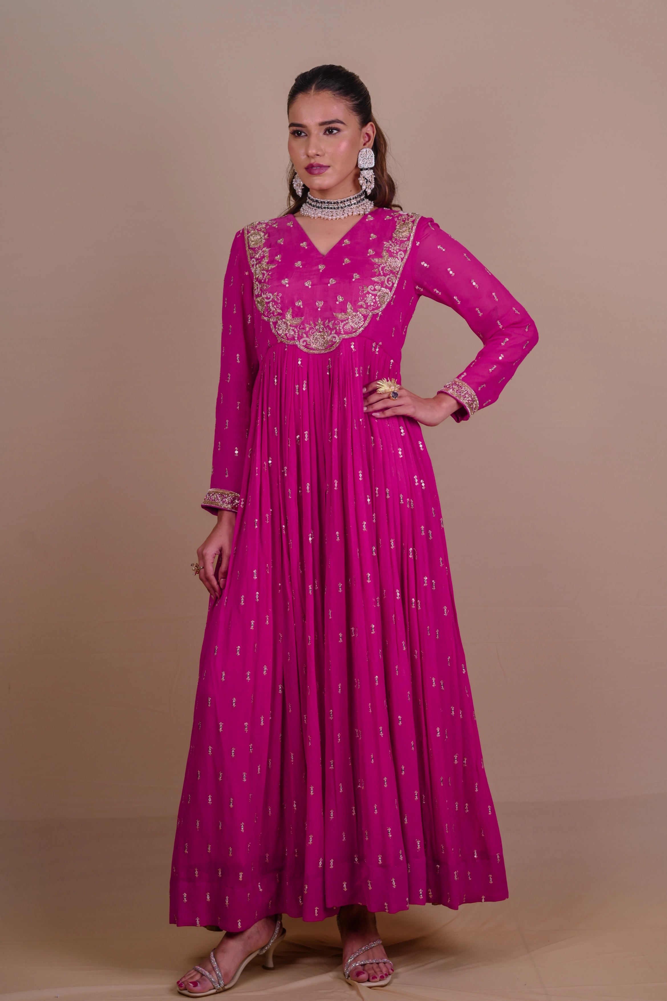 Features: -Rani pink, sequins embellished, pleated Anarkali. -Hand embroidered front yoke in Habutai silk. -Full sleeves with cuff hand embroidery. -Side zip opening.