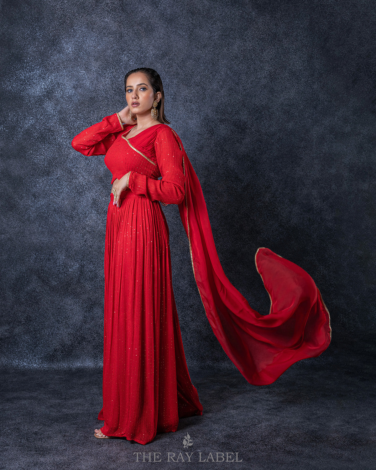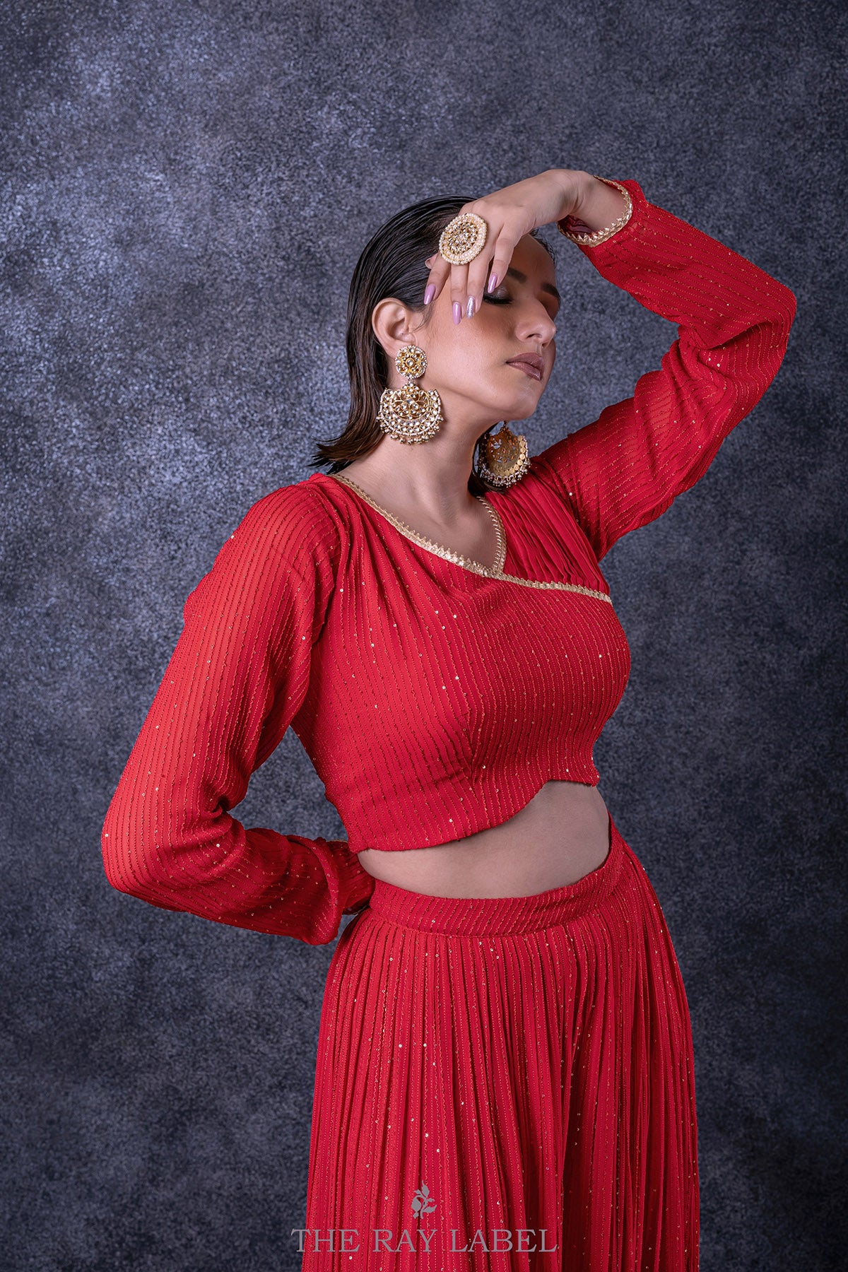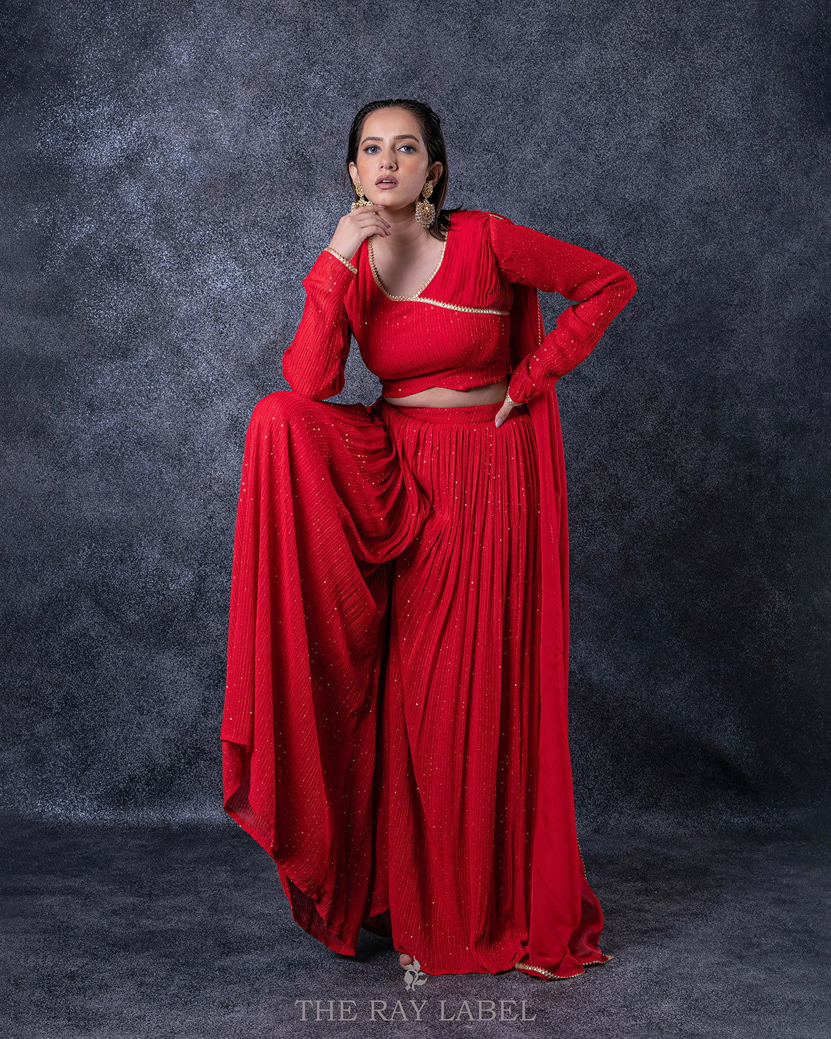 This two piece set includes a pleated sharara pants and blouse with attached dupatta. Work/features: Red sequins georgette blouse with one sided pleats and attached organza dupatta - V-neckline - Full length churidar sleeves. - Laced neckline and sleeves. - Side zip
