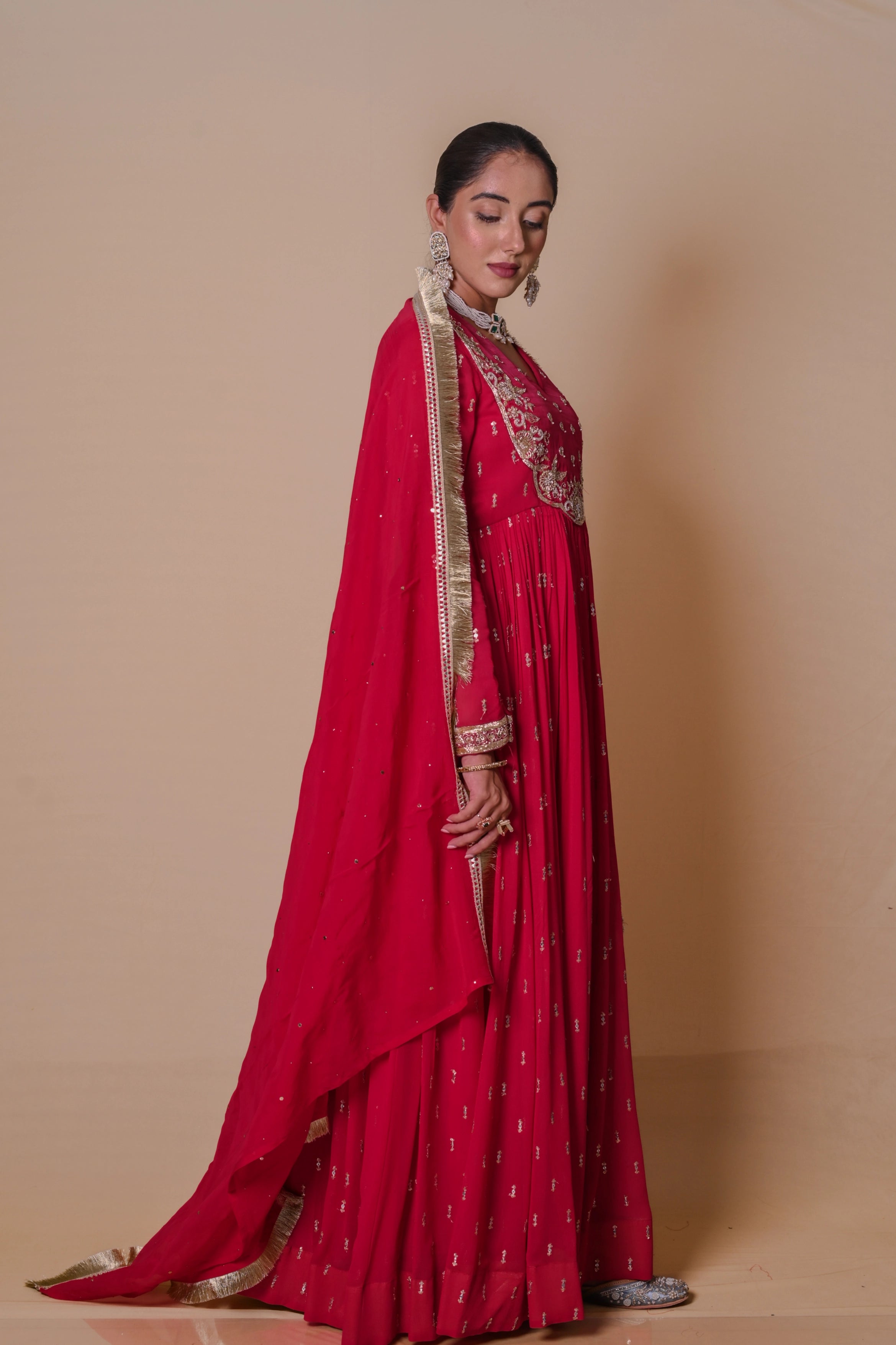 Features: - Red sequins embellished, pleated Anarkali. - Hand embroidered front yoke in Habutai silk. - Full sleeves with cuff hand embroidery. - Side zip - Full length - Mukaish embellished dupatta with trim finish.