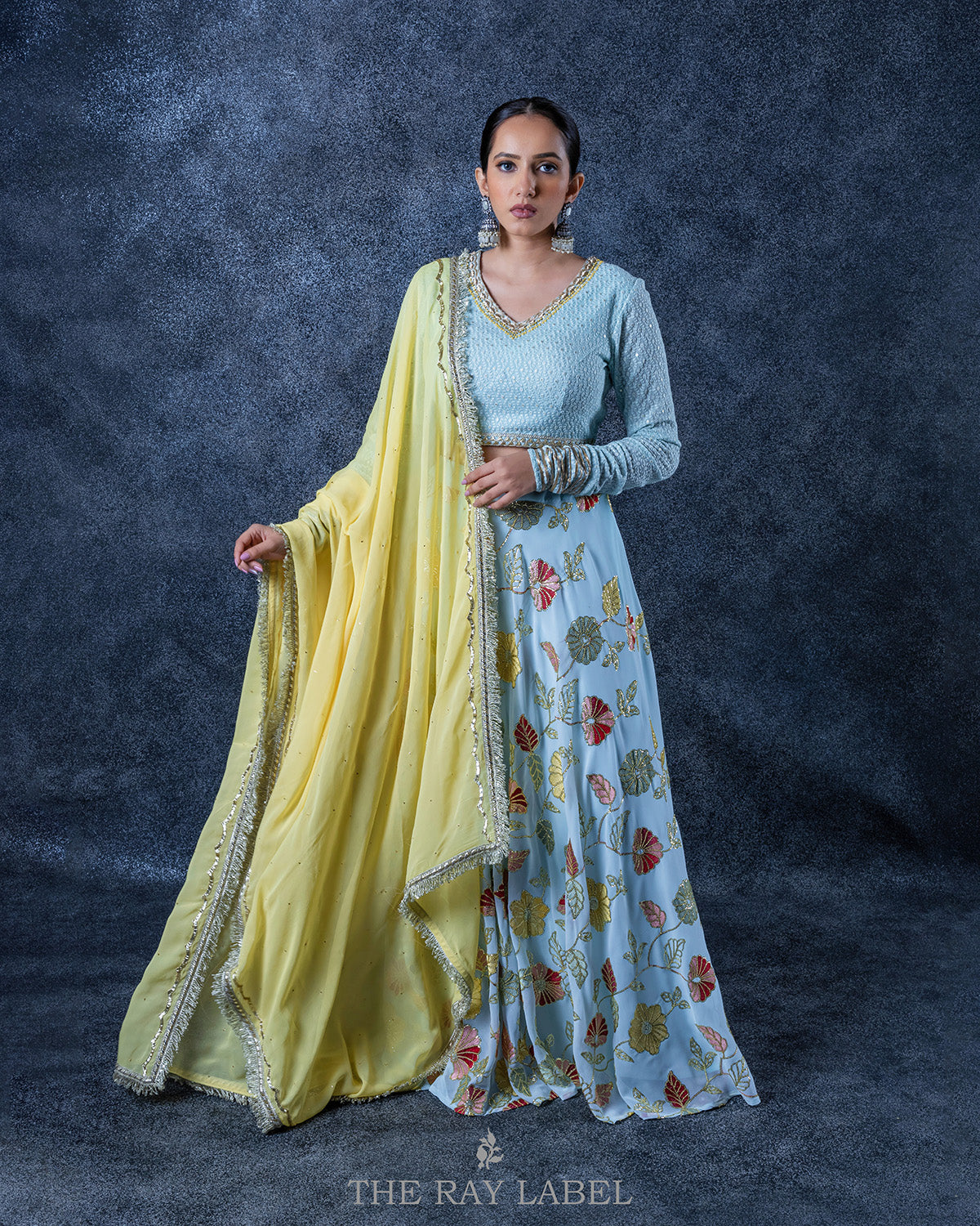 This 3 piece set includes lehenga, Chikankari blouse and lemon yellow dupatta Work/features- Sky blue embroidered georgette lehenga paired with a delicately hand embroidered blouse - Neckline: V shape front & eye shaped back - Churidar sleeves with gota laces embellishment - Chikankari georgette padded blouse & back hook opening - Zardosi embroidered neckline