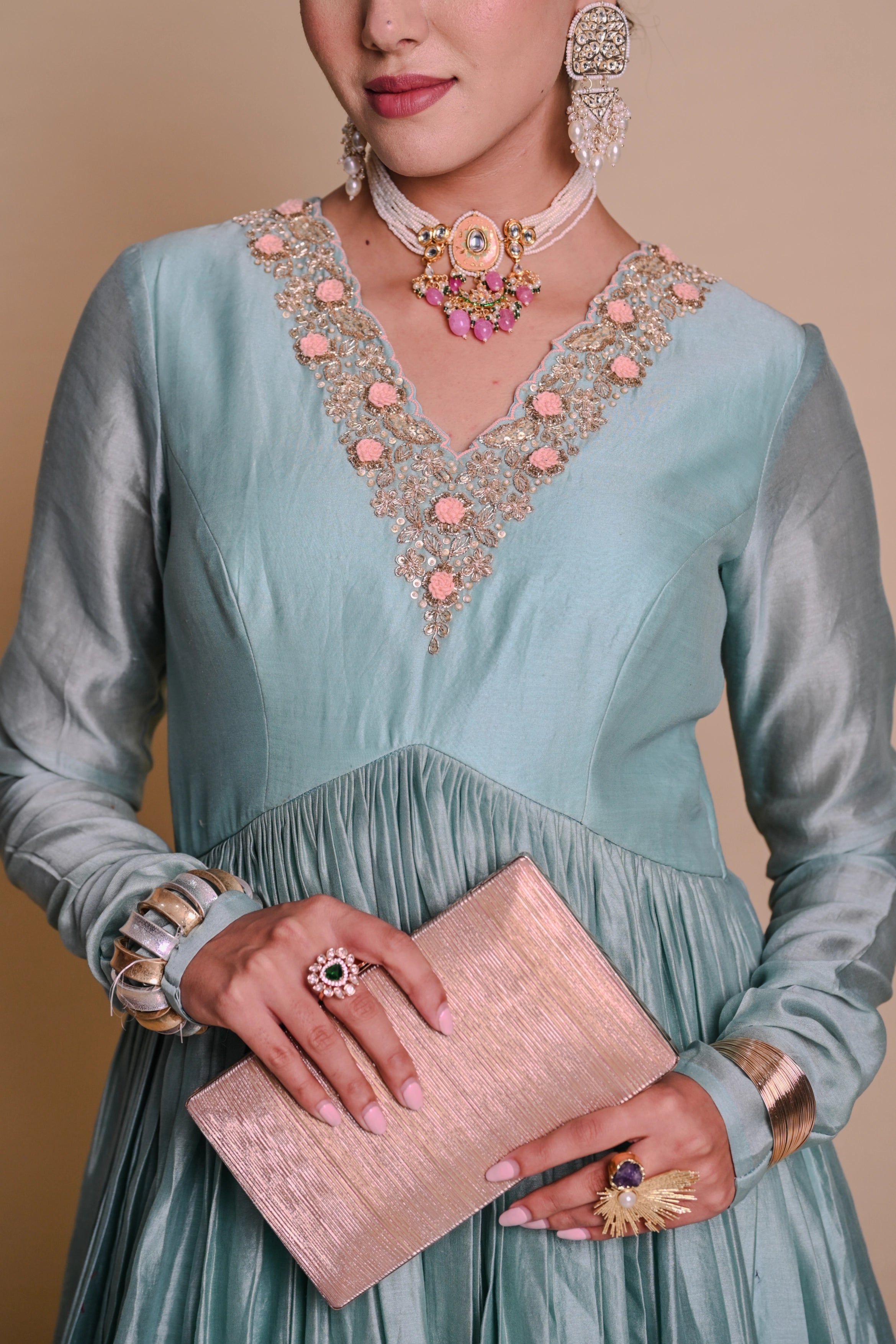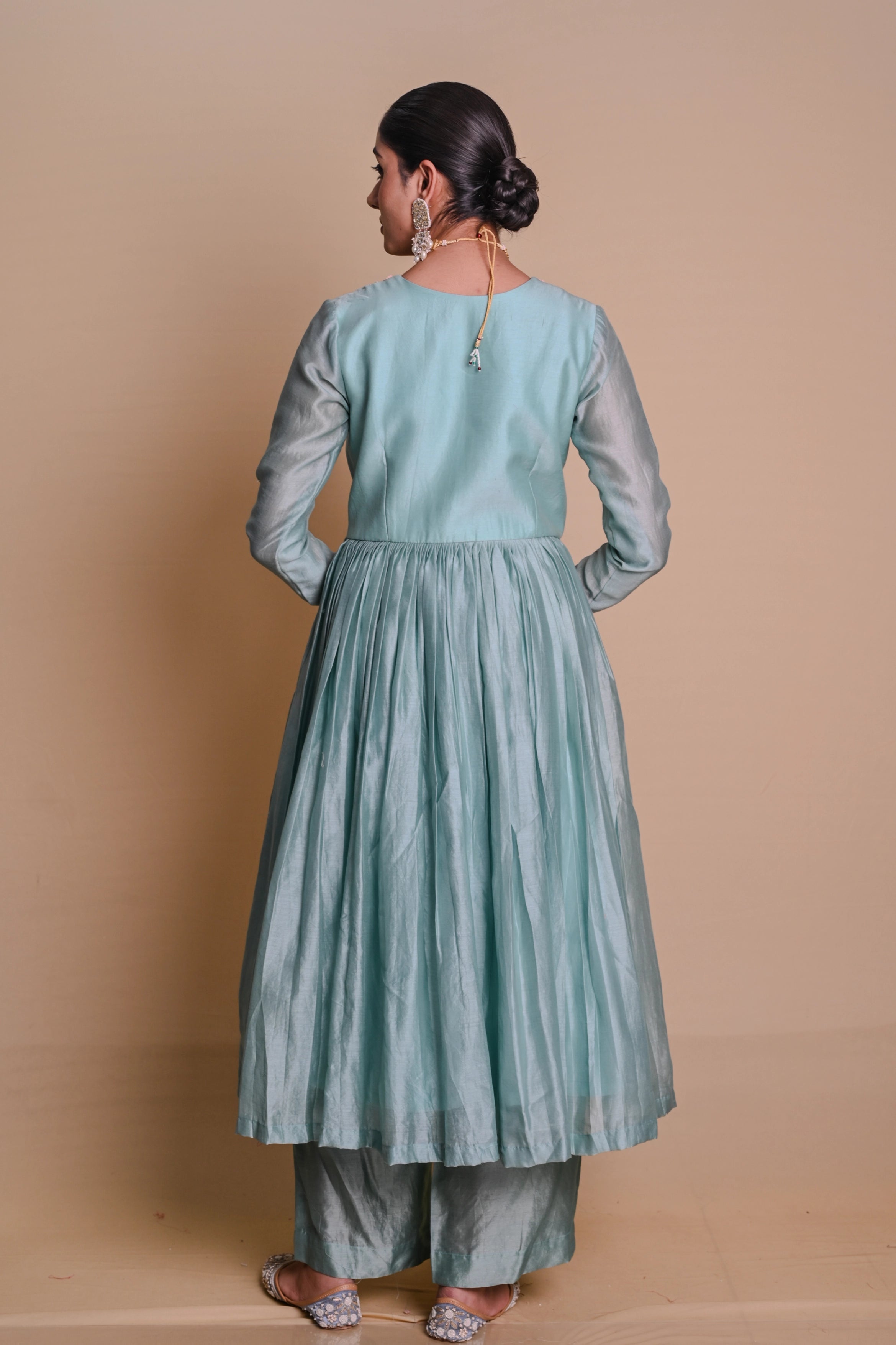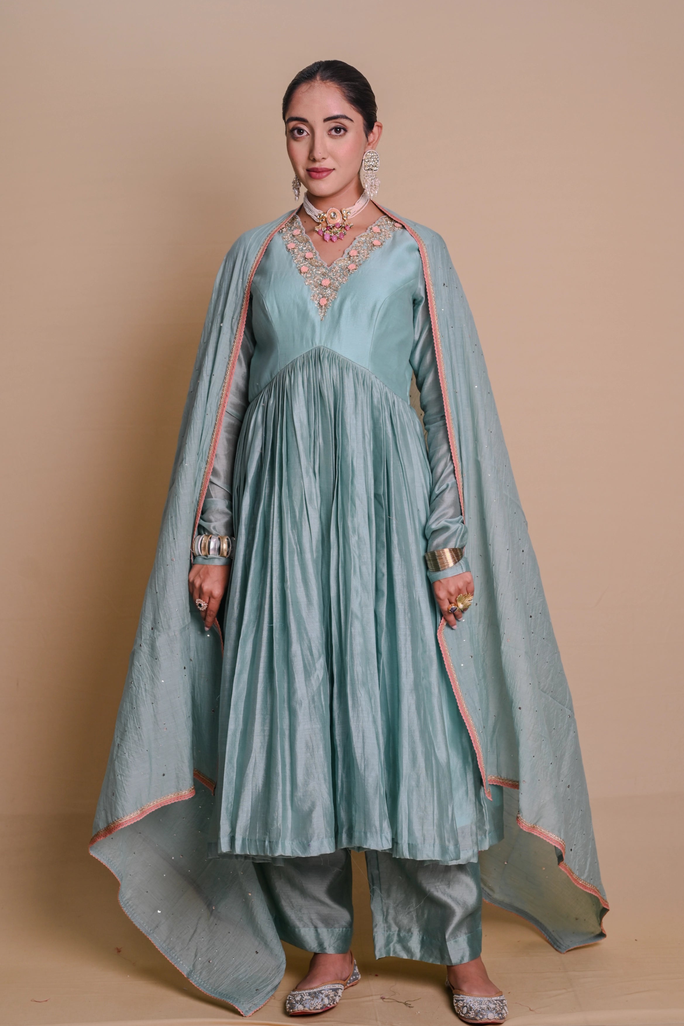 Features: -Chooridar sleeves, pleated Anarkali with hand embroidered yoke. -V shaped neckline- front - Silk Anarkali with side zip. - Straight pants with elastic waistline. - Mukaish embellished chanderi dupatta with lace trim finish.